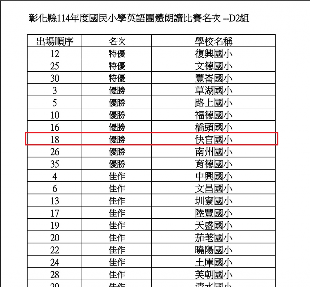賀!快官國小六年甲班參加彰化縣114年度國民小學英語團體朗讀...